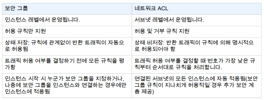 - 보안 그룹은 인스턴스에 대한 인바운드 및 아운바운드 트래픽을 제어하는 가상 방화벽 역할을 합니다.
