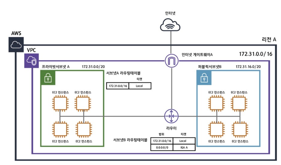 - 서브넷 B의 라우팅 테이블을 잘 보면 0.0.0.0/0으로 정의되어있습니다. 이 뜻은 모든 트래픽에 대하여 IGA (인터넷 게이트웨이) A로 향하라는 뜻입니다. 라우팅 테이블은 가장 먼저 목적지의 주소가 172.31.0.0/16에 매칭되는지를 확인한 후 매칭되지 않는다면 IGA A로 보냅니다.