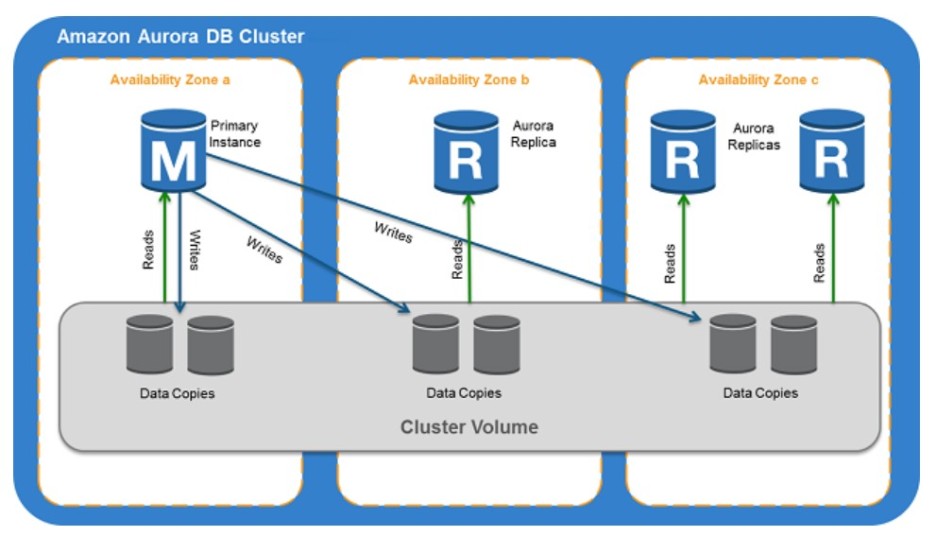 - Aurora 클러스터 볼륨은 다중 가용 영역을 아우르는 가상 데이터베이스 스토리지 볼륨으로서, 각 가용 영역에는 DB 클러스터 데이터의 사본이 있습니다.