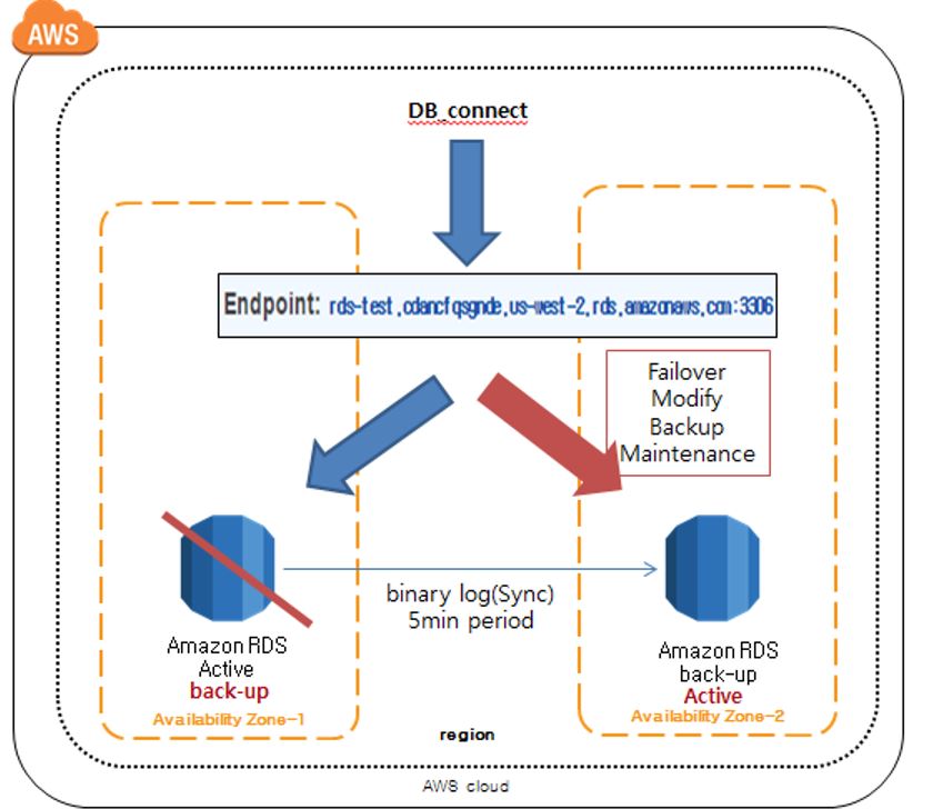 - 다중 AZ DB 인스턴스에 계획되거나 계획되지 않은 중단이 발생하는 경우 Amazon RDS는 다른 가용 영역의 예비 복제본 또는 보조 인스턴스로 자동으로 전환됩니다.