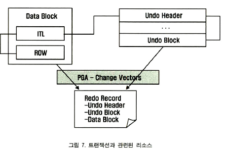 5) 변경할 블록들의 변경 정보는 PGA에 체인지 벡터라는 이름으로 저장한다. 보통 하나의 로우가 변경되는 경우 각각 언두 헤더 블록, 언두 블록, 데이터 블록에 해당하는 체인지 벡터들이 생긴다. 프로세스는 PGA의 체인지 벡터들을 리두 레코드라는 이름으로 리두 버퍼로 복사한다.