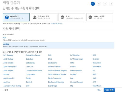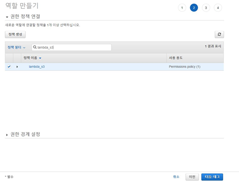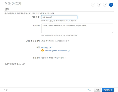 위에 만든 정책을 가지고 역할을 만들어줍니다. 추가적으로 DynamoDB에 접근하기 위하여 미리 생성되어 있는 템플릿 AmazonDynamoDBFullAccess를 정책으로 등록하였습니다