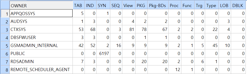 SELECT Owner, 0 AS "Tab", 0 AS "Ind", 0 AS "Syn", 0 AS "Seq", 0 AS "View", 0 AS "Pkg", 0 AS "Pkg Bds", 0 AS "Pro", 0 AS