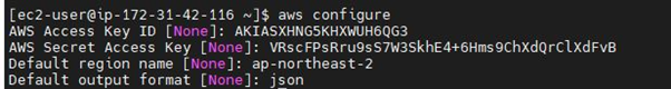 - 액세스 키 ID / 보안 액세스 키 / AWS 리전 / 출력 형식
