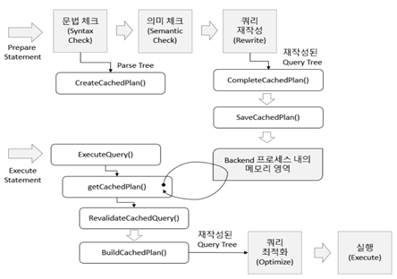 - PostgreSQL은 세션 레벨의 Plan Caching 기능을 제공한다. 이를 이용한 prepare Stmt 수행 구조도는 다음과 같다.